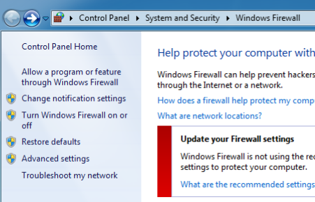 Turn Windows Firewall on or off 와 Advanced settings Troubleshoot my network 들어가서 끄기.