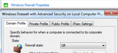 Windows Firewall Propeties 옵션에서 Domain Profile, Private Profile, Public Profile 전부 Off.