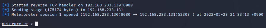 -p : 페이로드 옵션으로 다운로드한 윈도우에서 파일을 실행하면 공격자에게 연결해 공격자로 하여금 meterpreter shell 을 통해 접근할 수 있도록 한다.
