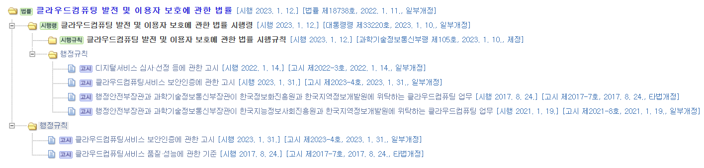 | 클라우드 | 클라우드컴퓨팅 발전 및 이용자 보호에 관한 법률 | 클라우드컴퓨팅 발전 및 이용자 보호에 관한 법률 시행령 | |