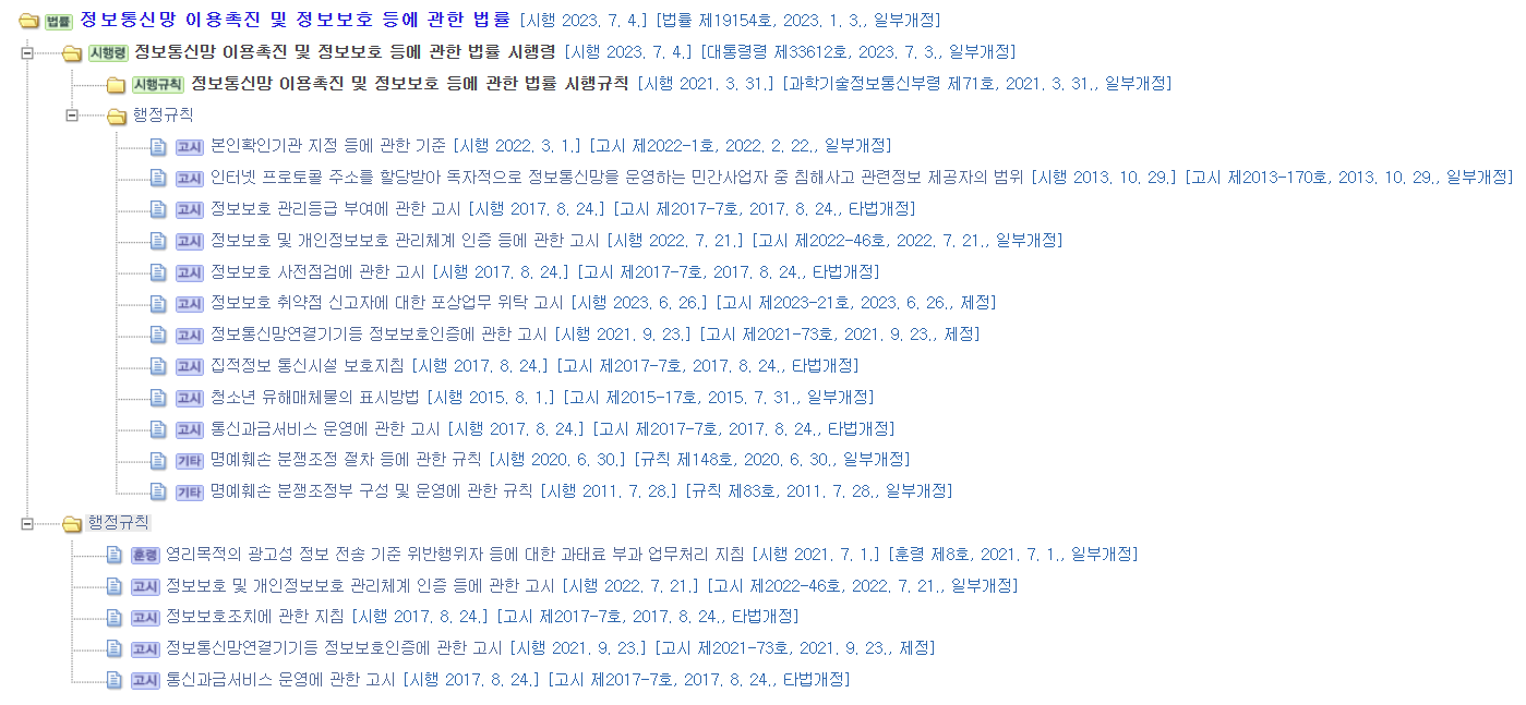 | 정보통신망 | 정보통신망 이용촉진 및 정보보호 등에 관한 법률 | 정보통신망 이용촉진 및 정보보호 등에 관한 법률 시행 | |