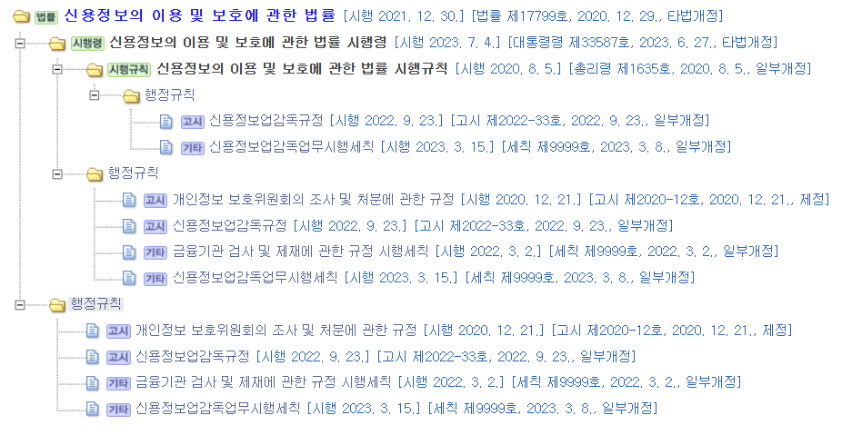 | 신용정보 | 신용정보의 이용 및 보호에 관한 법률 | 신용정보의 이용 및 보호에 관한 법률 시행령 |