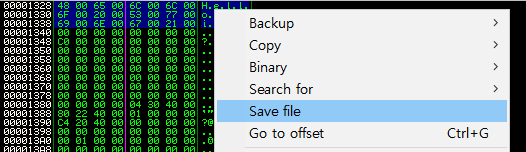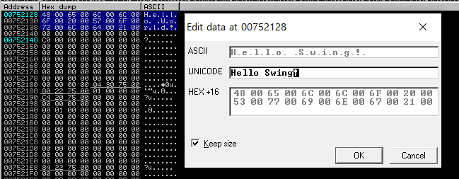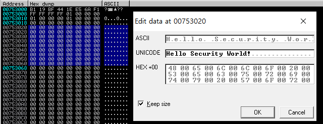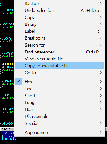 1. Dump 창에서 변경된 문자열을 선택하여 마우스 우클릭 -> Copy to executable file