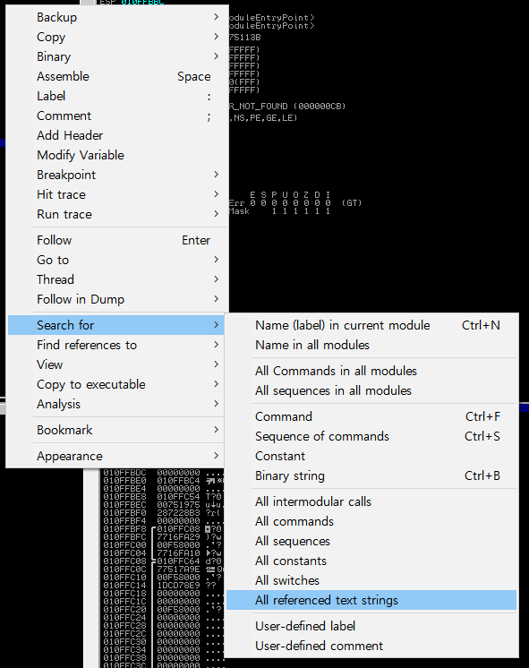 2. 문자열을 검색한다. 마우스 우클릭 -> Search for -> All referenced text strings