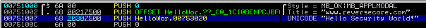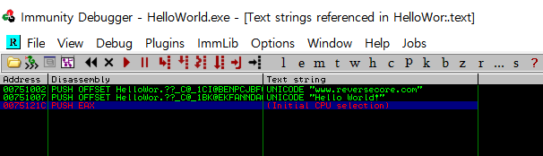 ( 코드 창에서 문자열 주소 부분 00751007 에 커서 놓고 Assemble 명령 [Space] bar 누르고