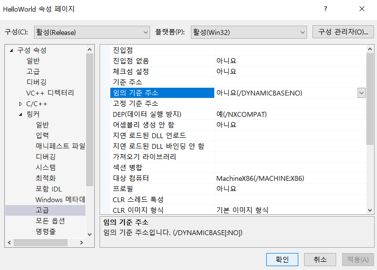 프로젝트 -> HelloWorld 속성 -> 링커 -> 고급 -> 임의 기준 주소 -> 아니요 (/DYNAMICBASE:NO)