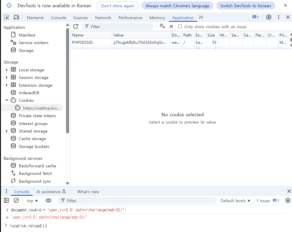 -> user_lv 쿠키가 없으면 /challenge/web-01/ 경로에 값을 1로 심고 새로고침합니다.