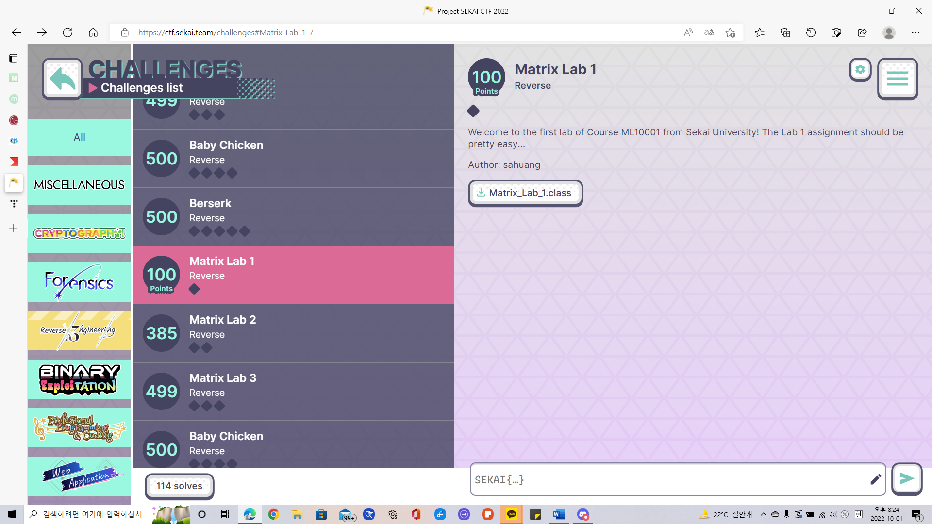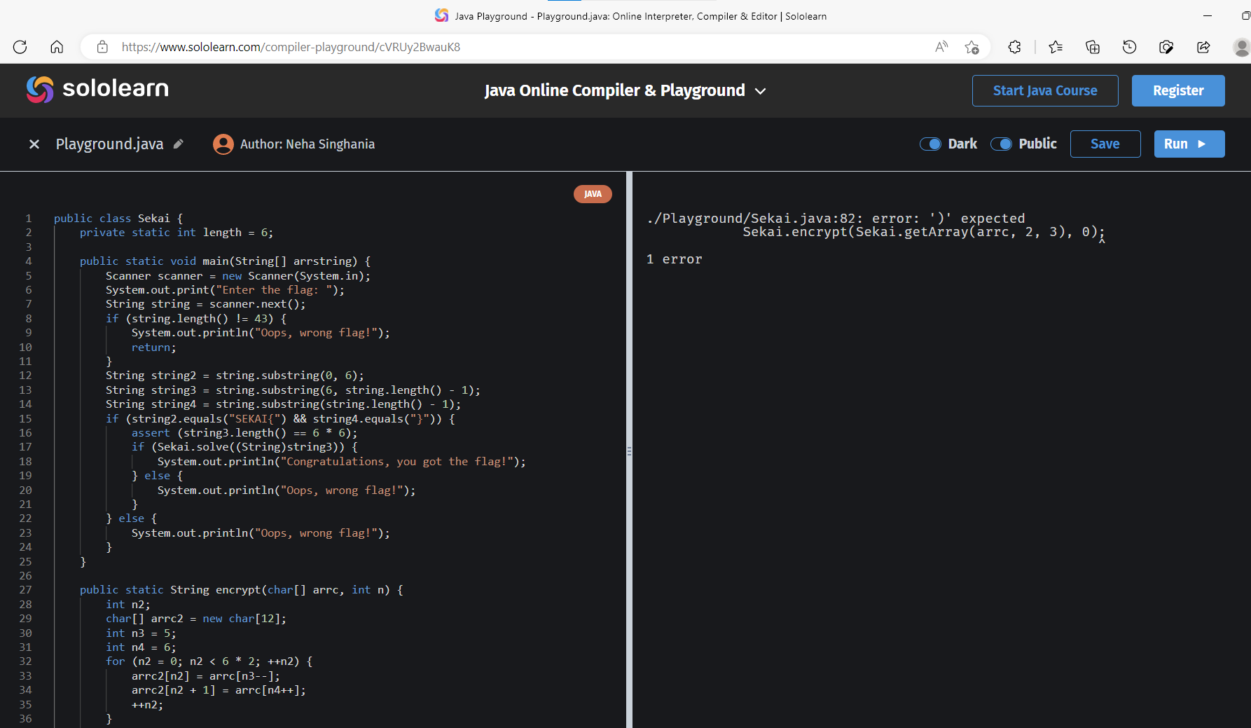 - SEKAI{...}문자열이 중괄호 사이에 36자를 포함하는 올바른 형식인지 확인 ( Sekai.main )