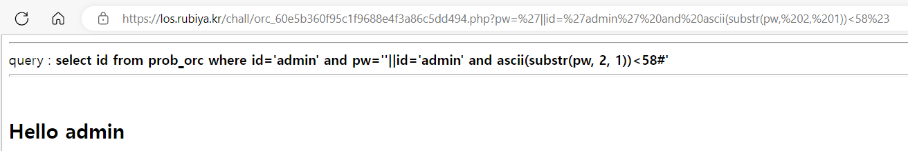 or id='admin' and 이후에 ascii와 substr을 이용하는 것인데 substr은 문자열 안에서 해당하는 문자를 입력한 범위만큼 불러온다. 즉 첫 번째 인수는 불러올 문자열 두 번째 인수는 시작점 세 번째 인수는 끝나는 지점이다.