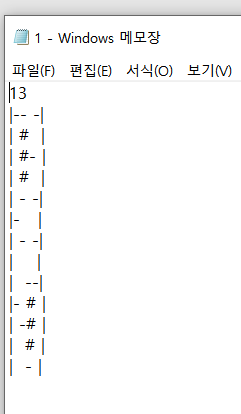 다음 N줄에서는 비트맵을 설명하는데, 각 줄은 길이가 6인 문자열이고, 첫번째와 마지막 문자는 기호 | 이다.