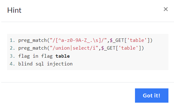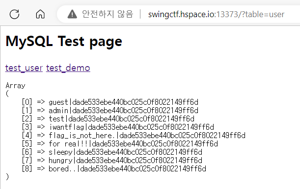 http://swingctf.hspace.io:13373/?table=demo%20cross%20join%20information_schema.tables%20as%20m%20cross%20join%20information_schema.columns%20cross