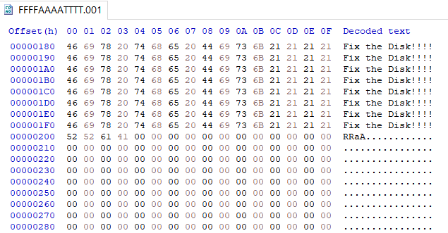 Fix the Disk!!!! 라는 문자열이 계속 나오다가 RRaA라는 글자 뒤로 보이지 않는 것을 확인할 수 있다.