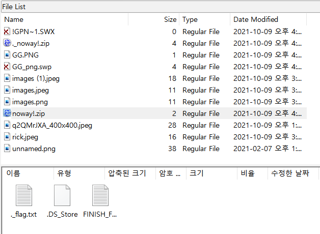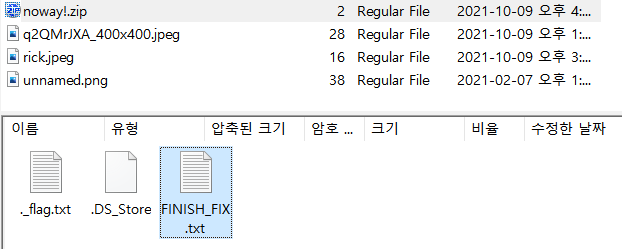 noway!.zip 압축 파일 안에 플래그로 보이는 txt 파일이 있다.