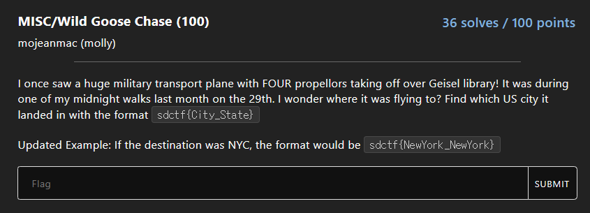 Updated Example: If the destination was NYC, the format would be sdctf{NewYork_NewYork}
