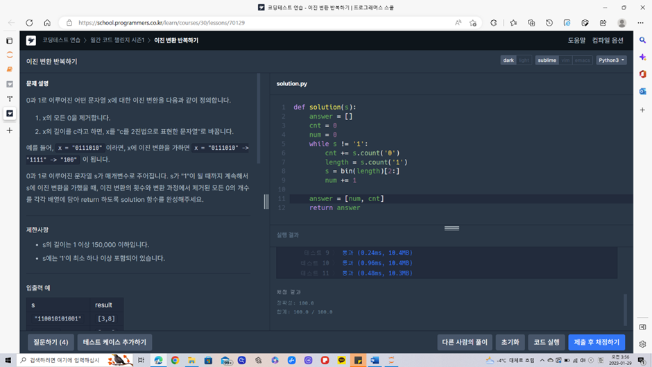 #16 중) 이진 변환 반복하기 (프로그래머스-이진 변환 반복하기)